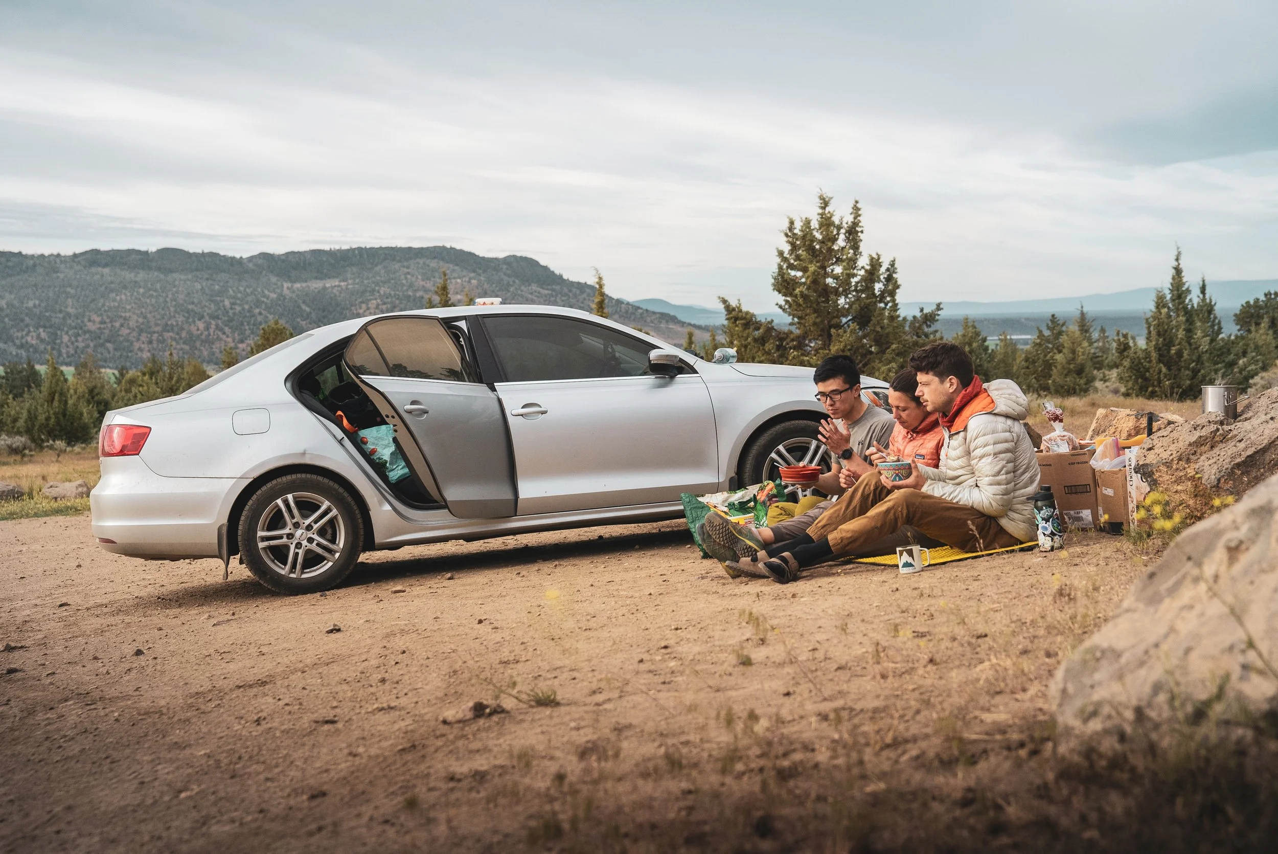 Wir fühlen uns zurückversetzt ins Präburritolitikum*: Ein Leben im Chaos zwischen Camping- und Klettermaterial. Kochen und Essen am Boden oder, bei ganz ungemütlicher Witterung, im Auto. Ständig den Elementen ausgesetzt.
