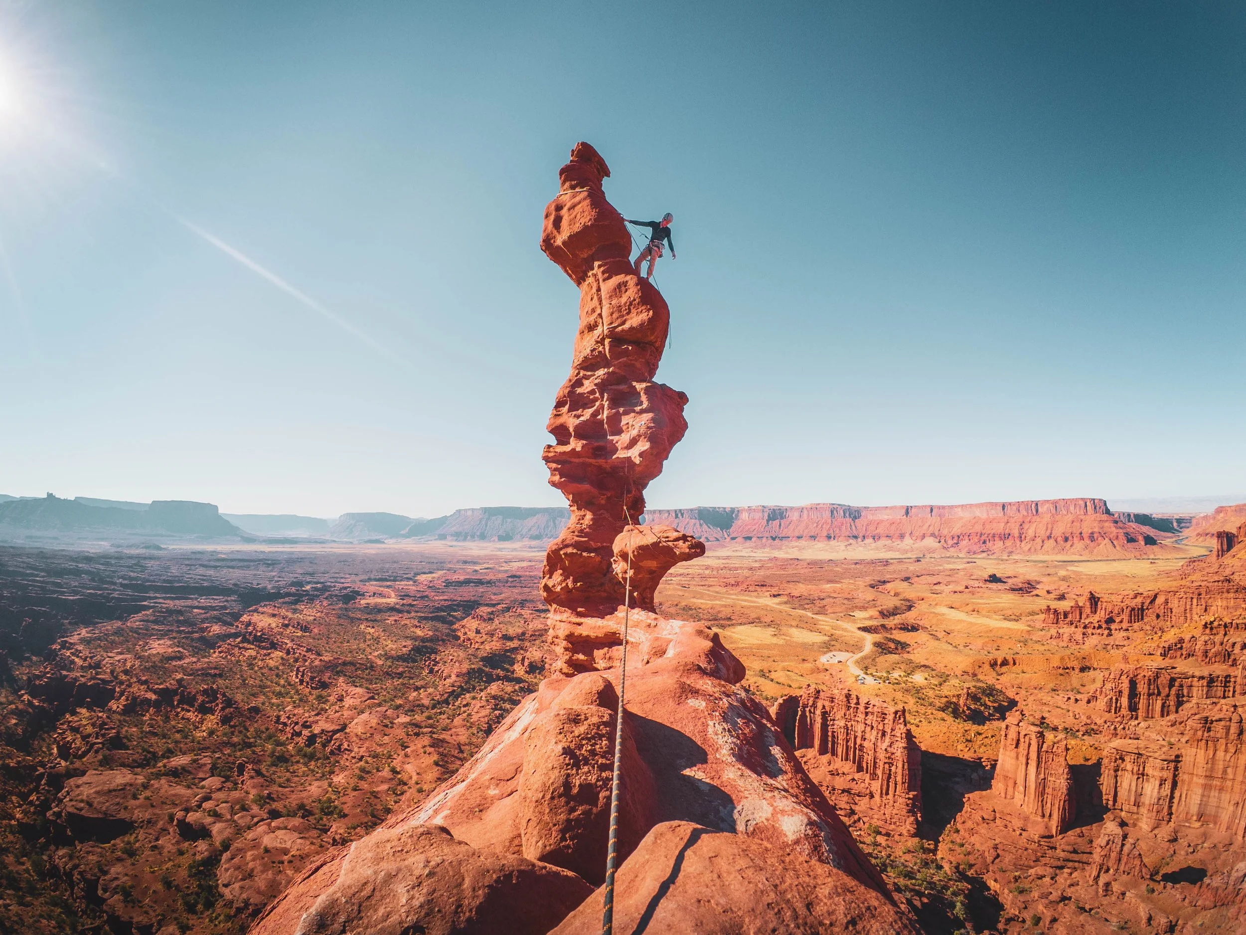 Bepackt mit Geburtstagskuchen, Klettermaterial und Drohne stapfen die beiden bei Dämmerung auf bröckeligem Untergrund zum Einstieg. Vom Auto betrachtet präsentiert sich der Eagle Plume Tower als schmaler, scheinbar unüberwindbarer Pfeiler. Von der Seite gleicht er eher einer Irokesenfrisur. Vier Seillängen trennen sie vom Gipfel. Die ersten beiden Seillängen zeigen deutlich den abenteuerlichen Charakter, den man beim Klettern von Wüstentürmen erwarten darf: Brocken von losem Gestein, dass unter Händen und Füssen wegzubrechen droht. Je höher sie kommen, desto kompakter ist der Stein. Die senkrechten Risse verlangen den beiden doch einiges an technischer Versiertheit und Nerven ab.